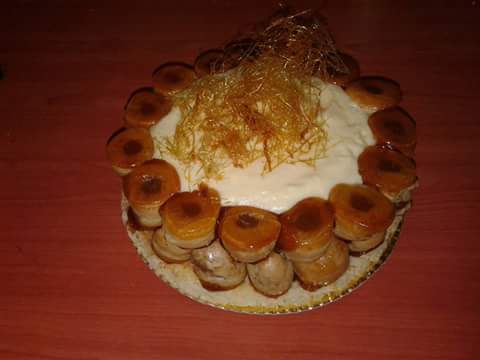 Postre preparado con una base de pionono, y con un borde de profiteroles rellenos de dulce de leche repostero o crema pastelera (a eleccion) y relleno con una crema mousse de limón y vainilla. Y una decoracion rustica de hilos de caramelo.