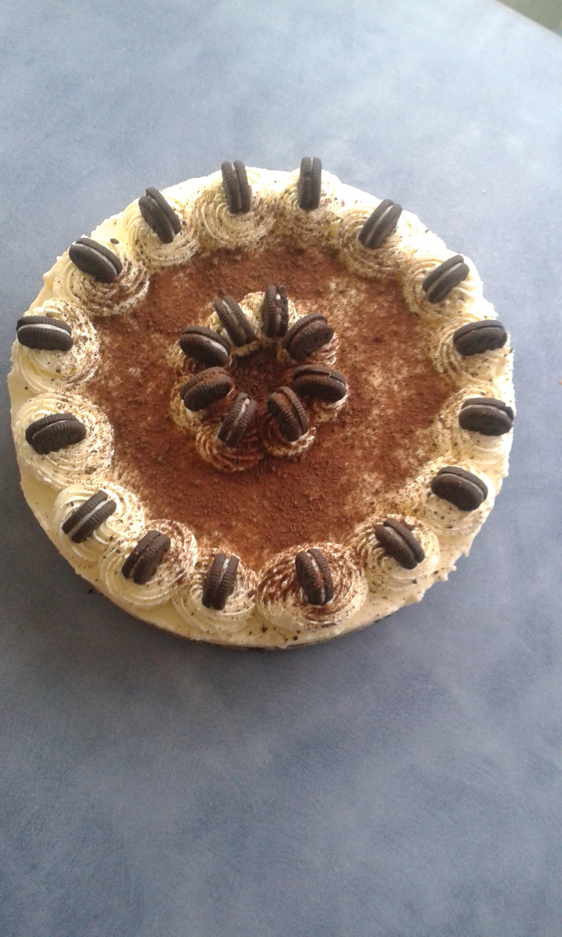 Base de galletitas oreo, con un relleno de mousse de vainilla y decorado con mini galletitas oreo y cacao en polvo.