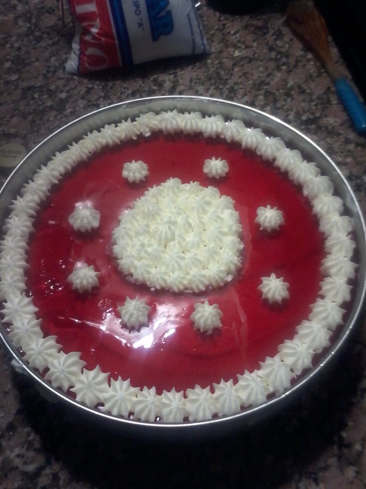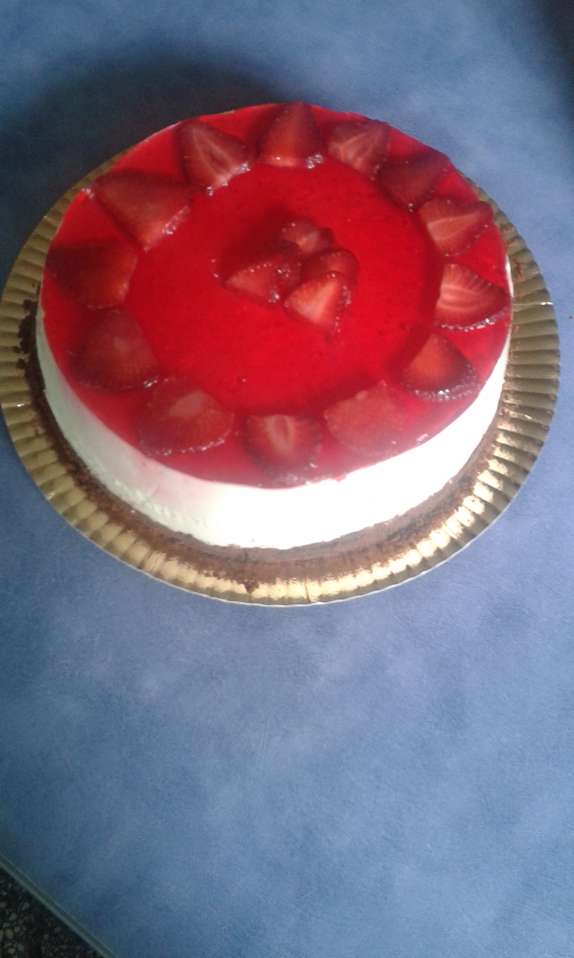 Postre con una base de galletitas y una crema mousse de vainilla, de orado con frutillas y gelatina de frutillas, y crema chantilly (opcional).